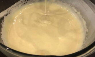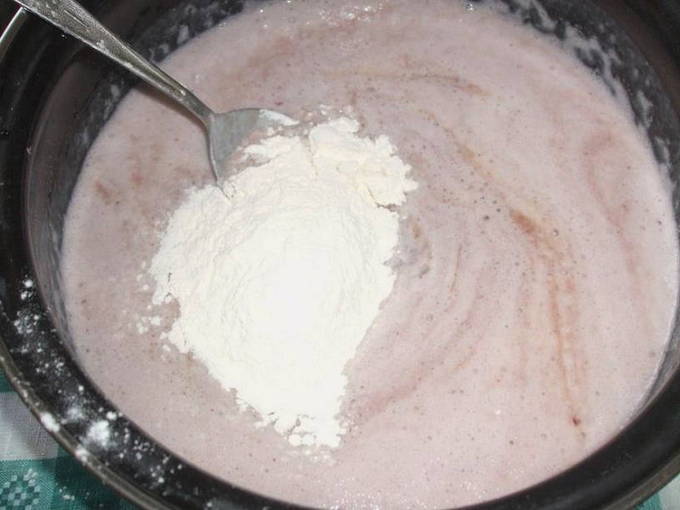 - Zeef de bloem in een aparte container en voeg er soda aan toe, giet het in een kom met het mengsel, roer tot de vloeistof dik wordt.