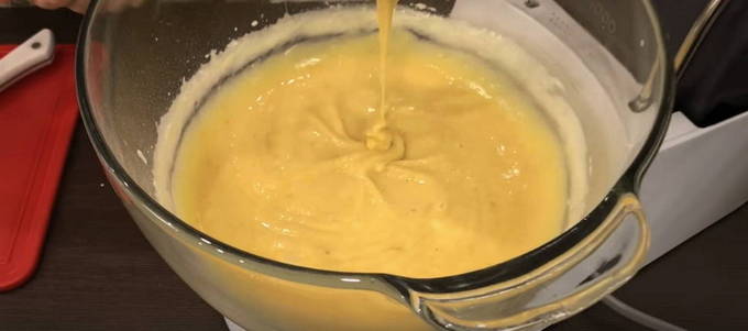Klop in een aparte kom de eieren met een mixer tot ze luchtig schuim zijn. Giet suiker in het mengsel en klop opnieuw tot de massa wit wordt en groter wordt.