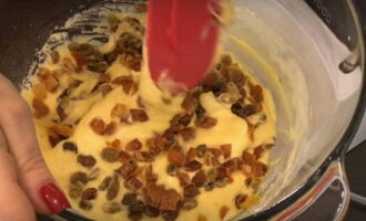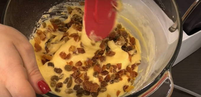 - Giet gedroogd fruit met heet water in een aparte kom. Rijd het ei in een andere container en voeg 2/3 kopje suiker toe. Mix met een garde tot een glad beslag.