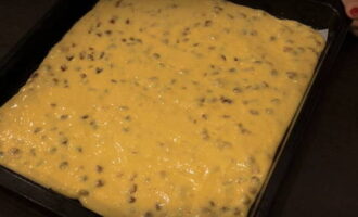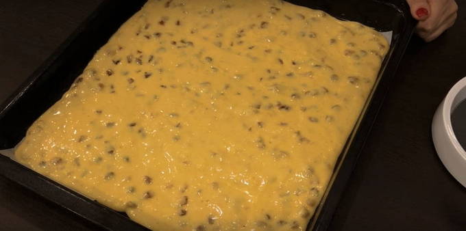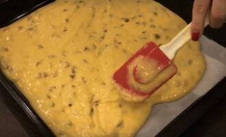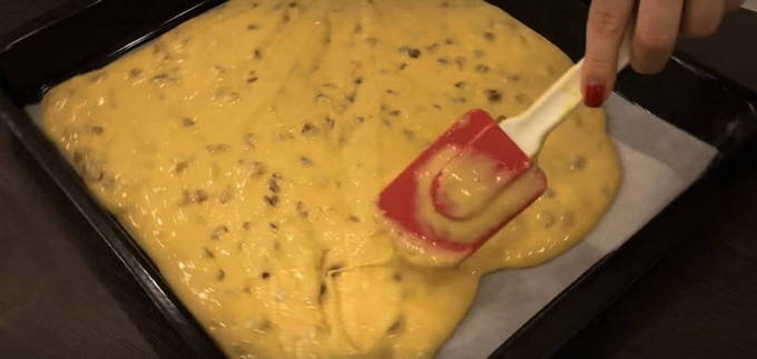 Spreid het bakpapier uit op een bakplaat en giet het mengsel voorzichtig uit. Verdeel het gelijkmatig.