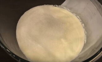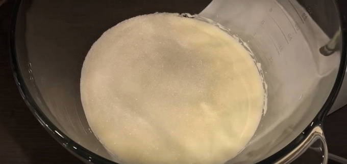 - Terwijl de broodjes "passen", bereidt u de room voor. Giet zure room in een aparte container en giet dan een glas suiker. Klop met een mixer tot een gladde massa.