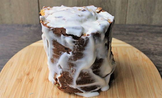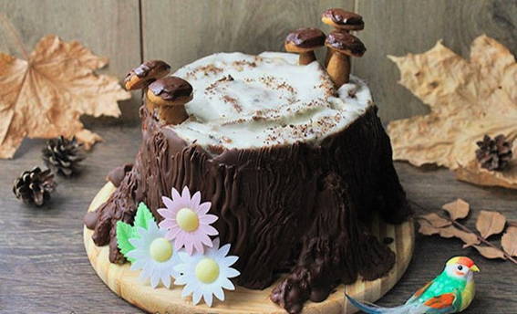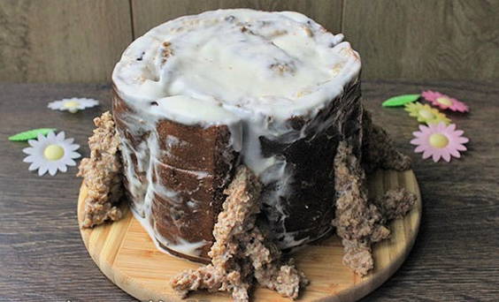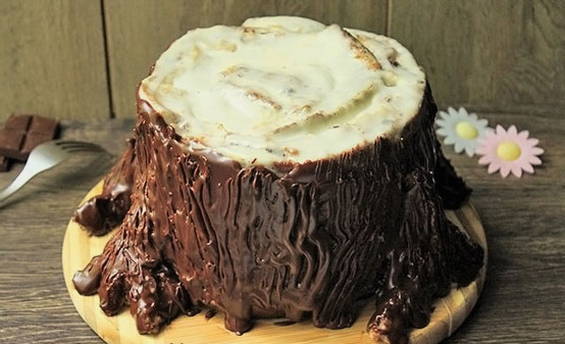Door de gecondenseerde melk in de cake lijkt het echt op een rotte boomstronk. En donkere jam geeft het product een grijsachtige tint, wat het effect nog versterkt.