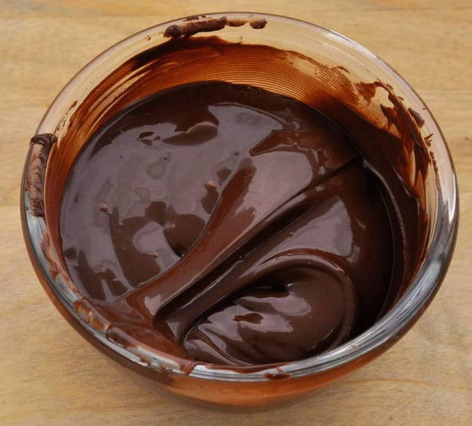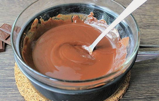 - Wanneer de afgesproken tijd is verstreken, beginnen we met het bereiden van de kers. Doe chocolade (in stukjes breken) en boter in een apart bakje. We zetten een pan met kokend water op zodat de producten uit de stoom smelten.