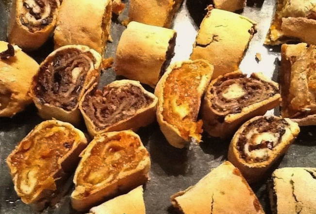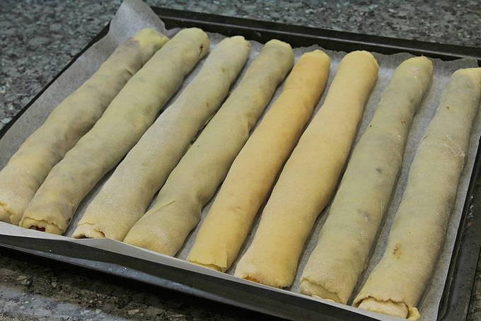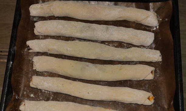 - Na 30 minuten halen we het deeg uit de koelkast en vormen het tot een tourniquet. Snijd in 8 gelijke delen. Rol elk deel uit tot een dunne rechthoek, breng de vulling aan en verdeel deze over het hele oppervlak van de laag. We veranderen in een rol. Dit doen we met alle onderdelen. Verwarm de oven voor op 180 graden. Bedek de bakplaat met bakpapier, leg de rollen neer. Wij bakken 45 minuten.