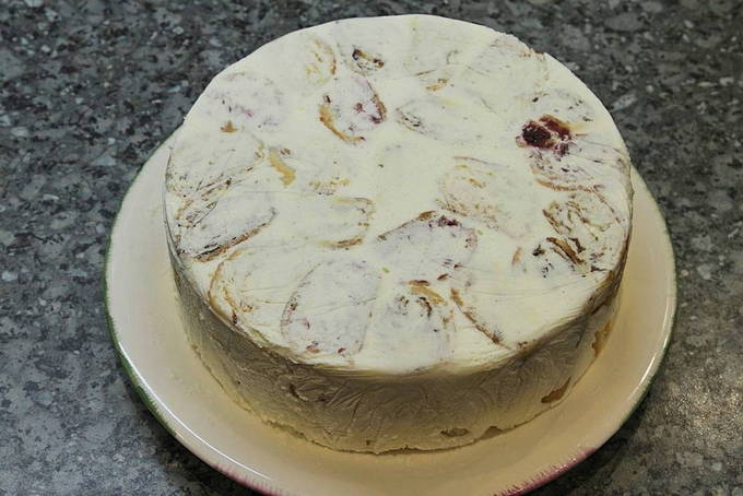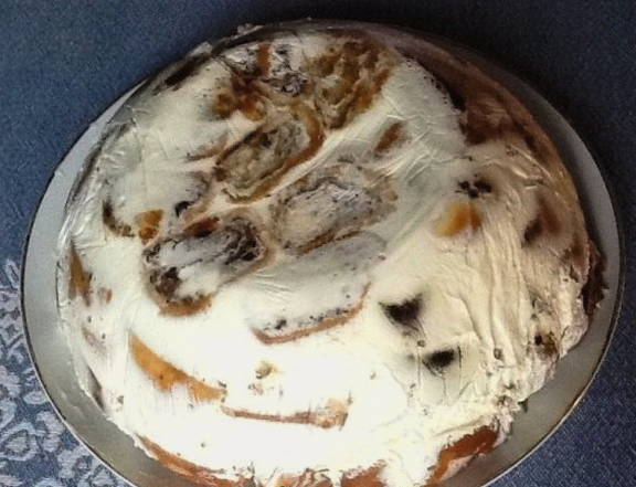 Zure room in het deeg geeft de cake een pracht en ongewone smaak. Door de grote hoeveelheid gedroogde vruchten en noten blijkt het product matig zoet en zelfs gezond te zijn.
