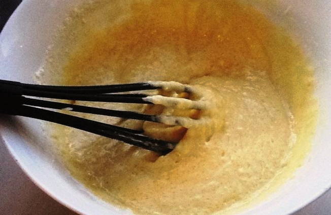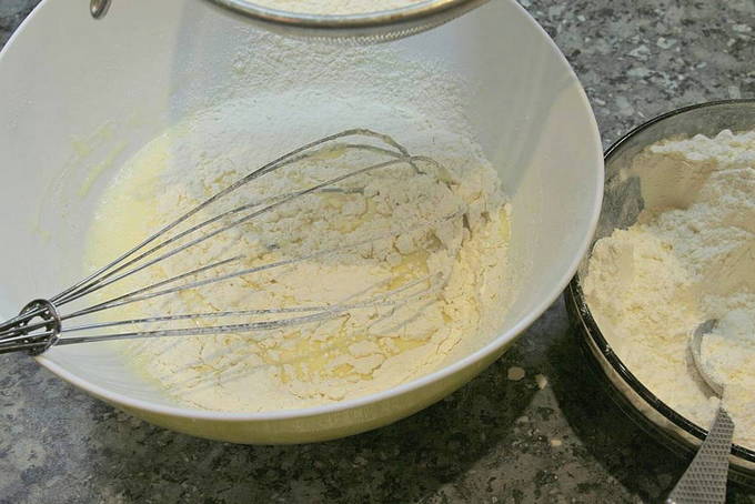 - Zeef bloem in een andere container. Voeg bakpoeder toe en meng. Giet het mengsel in de ei-suikervloeistof en meng met een spatel, en kreuk het dan met onze handen op het werkoppervlak.