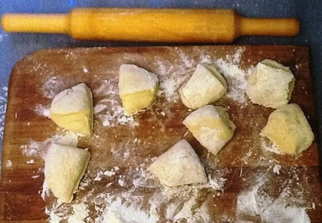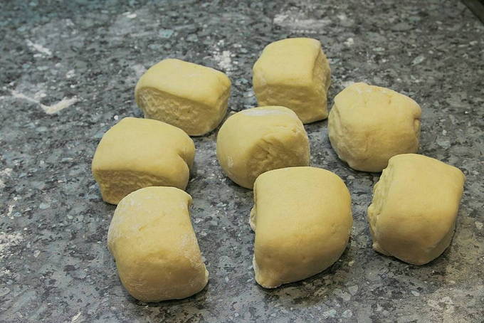 - We halen het deeg uit de koelkast en rollen het een beetje uit. We snijden het in 8 gelijke delen.
