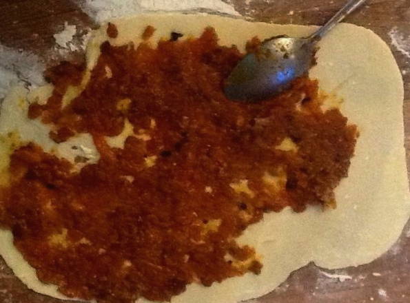 - Met behulp van een deegroller vormen we cakes en leggen we de vulling op elk van hen.