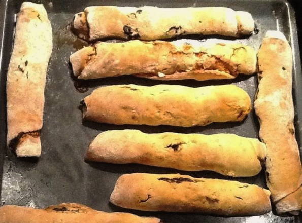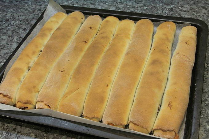 - Nadat de tijd is verstreken, halen we de afgewerkte broodjes eruit en laten ze afkoelen. We snijden de rollen in stukjes van 3 centimeter.