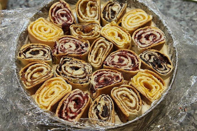 - We nemen een ovenschaal zodat je de bodem kunt verwijderen, afdekken met folie en de room over het oppervlak verdelen (3 eetlepels). We leggen minirolletjes in lagen. Giet de rolletjes er goed overheen. We voeren dezelfde manipulaties uit met andere lagen.
