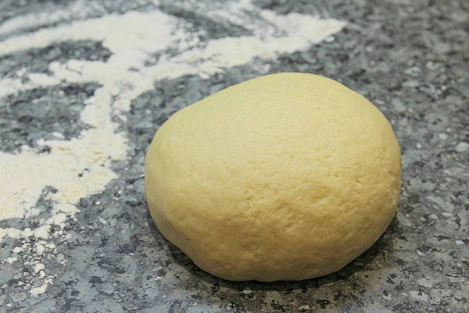 - Begin in een aparte kom het deeg te kneden. We rijden in een ei, voegen suiker en zout toe. Vervolgens sturen we zure room, boter (smelt vooraf), bakpoeder (het moet worden gedoofd met azijn). Meng de ingrediënten tot een enkele massa. Giet de bloem één voor één bij het mengsel en meng met een spatel. Breng de klont over naar een snijplank en kneed het deeg. Wikkel in plasticfolie en leg 30 minuten in de koelkast.