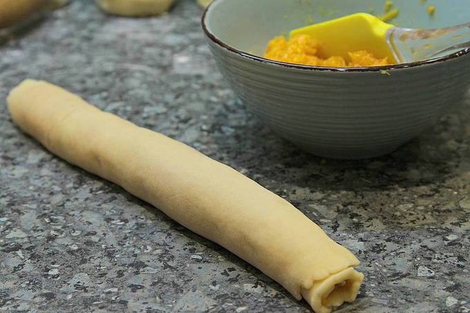 - Rol het gevulde deeg nu voorzichtig op tot een rol.