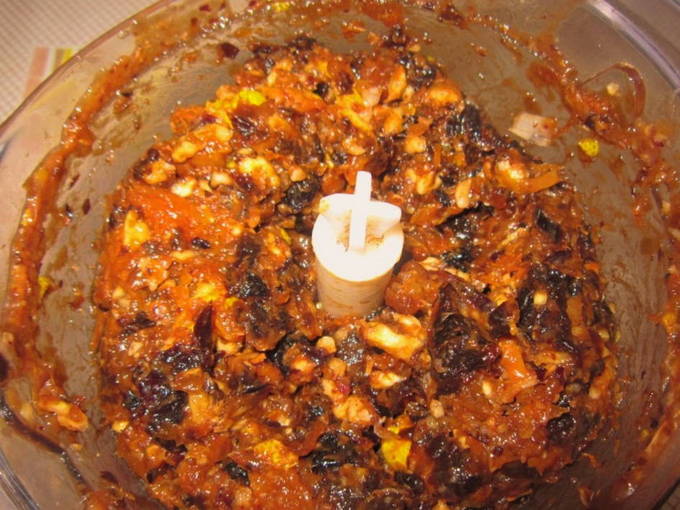 - Laten we voor de vulling zorgen. Maal de geweekte gedroogde vruchten, noten met een vleesmolen of keukenmachine (apart).