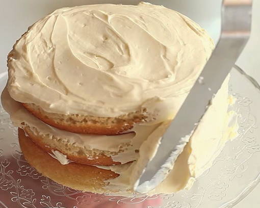- We smeren de cakes in met room, verwerken de zijkanten van de cake ermee met een breed mes of spatel.