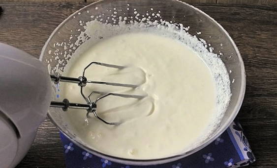 - Het blijft om de crème te bereiden. Giet zure room in een kom en voeg suiker toe. Klop met een mixer tot een gladde massa.