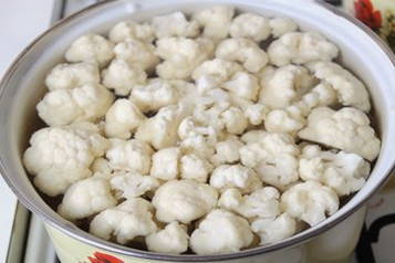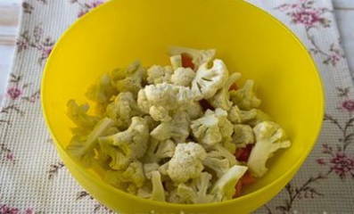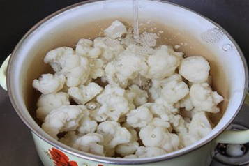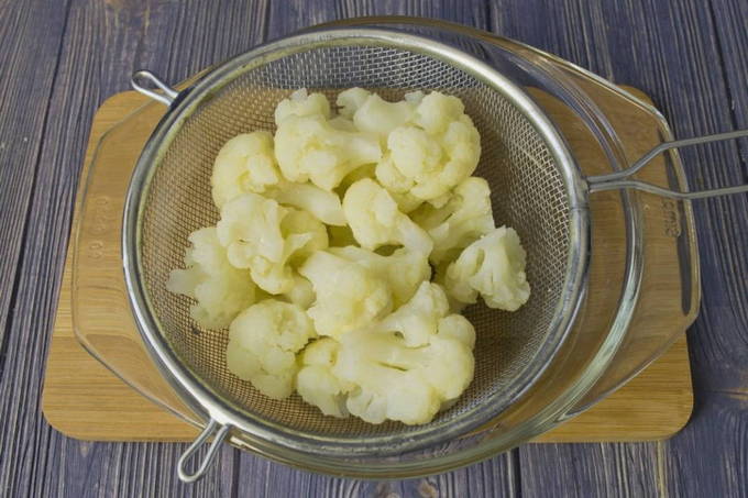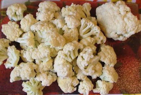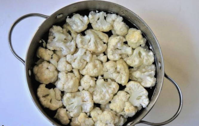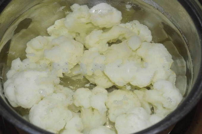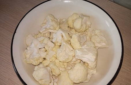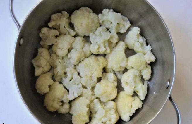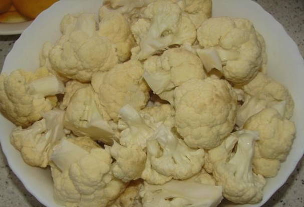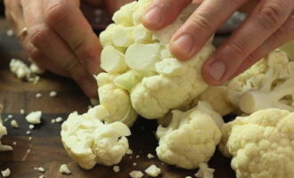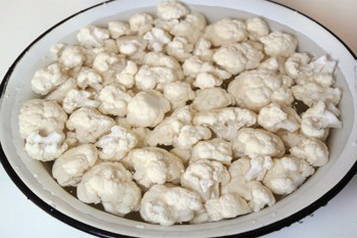 - We wassen de bloemkool, verdelen deze in bloeiwijzen en weken gedurende 15 minuten in een kom met koud water.