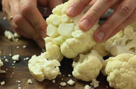 Spoel de bloemkool grondig onder water en verdeel hem vervolgens voorzichtig in bloeiwijzen.