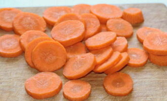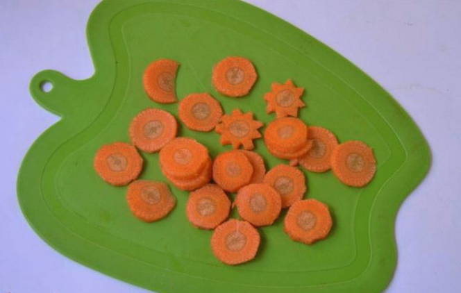 - We snijden de groente op elke handige manier. Je kunt het in dunne cirkels snijden en figuurlijk uitknippen.