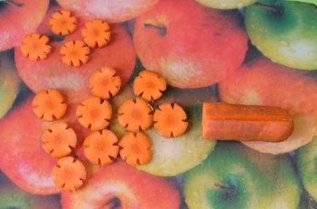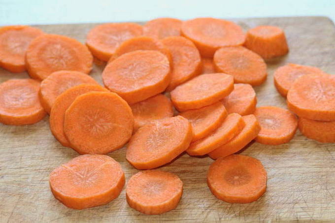- Schil de wortelen en snijd ze in dunne plakjes. Te grote stukken kunnen gehalveerd worden.