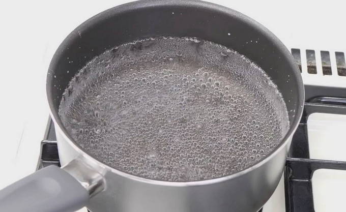 - Vervolgens wordt het product gedurende drie minuten ondergedompeld in kokend water.