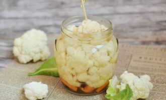 Plaats de knoflook, wortelen en koolbloeiwijzen stevig in schone en droge potten. Vul de inhoud met hete marinade en sluit de deksels. Laat de blanco's afkoelen tot kamertemperatuur, en dan nemen we ze mee voor opslag.