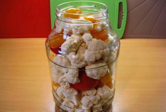 - We wassen de tomaten onder water en doen ze in een voorbereide pot samen met koolbloeiwijzen. We wisselen producten af.