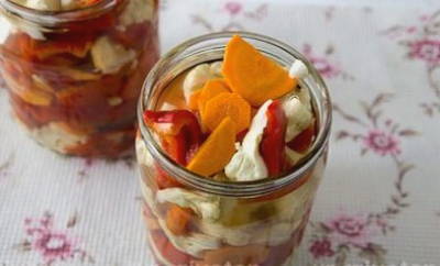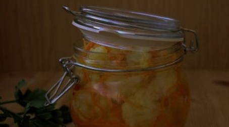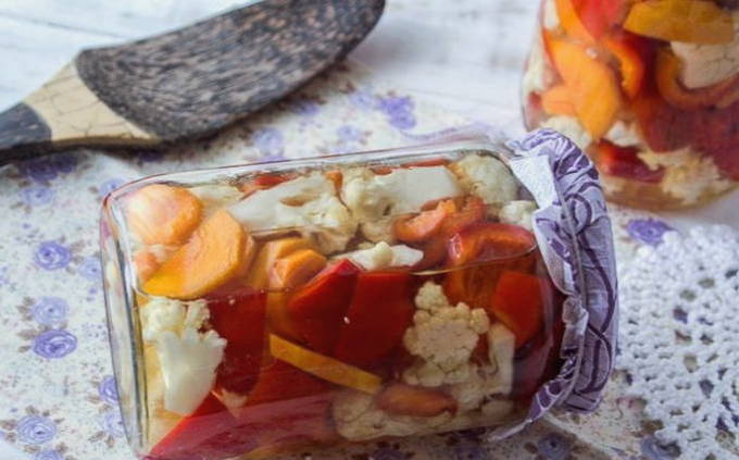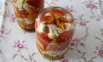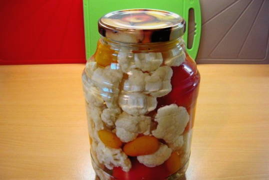 - Salade voor de winter van bloemkool, wortel en paprika is klaar. Kan op lange termijn worden opgeslagen.