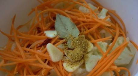 - We combineren alle bereide gerechten in een gemeenschappelijke kom. Hieraan voegen we laurierblaadjes, gepelde knoflookteentjes en kruiden voor Koreaanse wortelen toe. We mengen de inhoud.