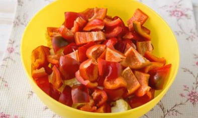 - We halen de paprika's van de zaden en het klokhuis en snijden ze vervolgens in kleine stukjes. Doe in een gemeenschappelijke kom.