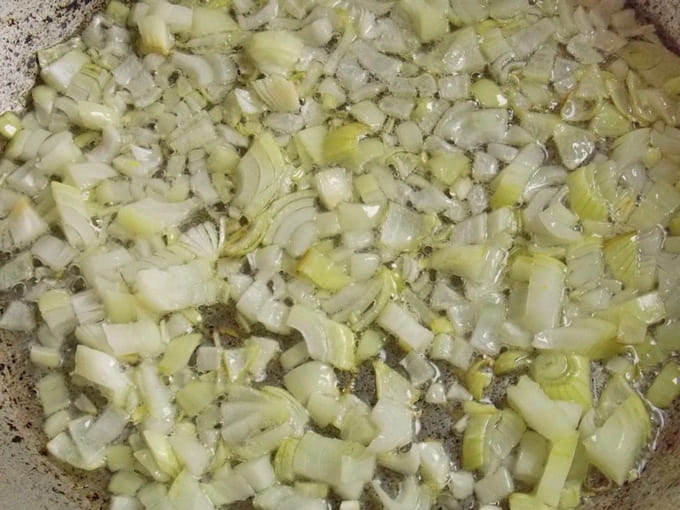 Schil de uien, droog ze en snijd ze in kleine blokjes. Verhit in een diepe, dikwandige koekenpan een kleine hoeveelheid geraffineerde plantaardige olie en giet de gesnipperde ui erin. Bak het onder af en toe roeren transparant.