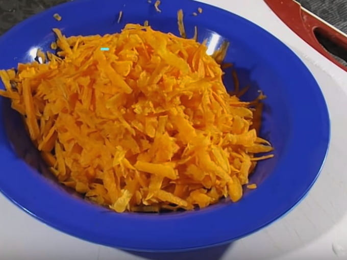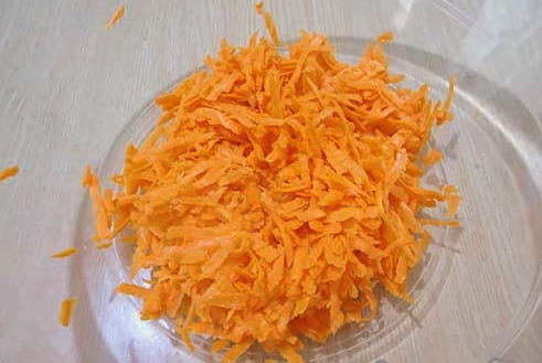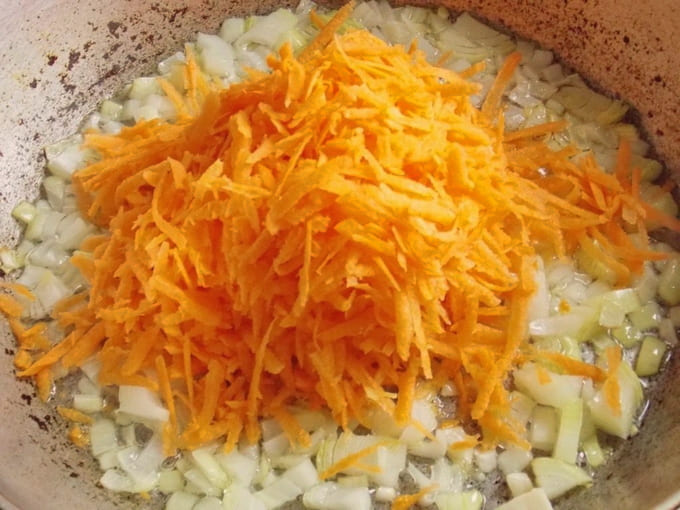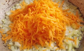 Schil de wortelen, was en wrijf op een grove rasp. Giet het over de ui die transparant is gemaakt en meng. We blijven het groentemengsel nog twee tot drie minuten bakken, waarbij we de temperatuur van de kachel op een gemiddelde waarde houden. De wortelen moeten zacht worden. Voeg indien nodig meer plantaardige olie toe.