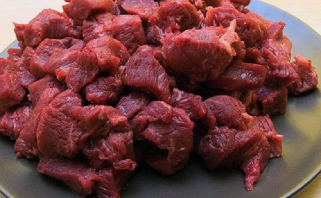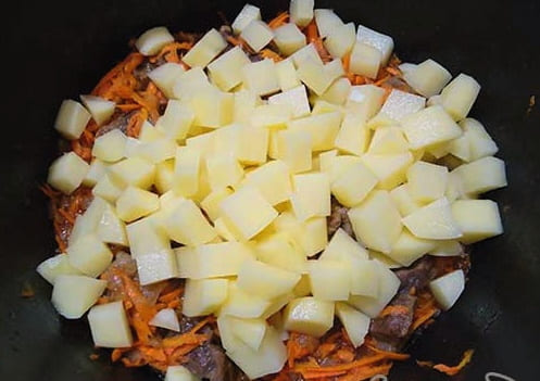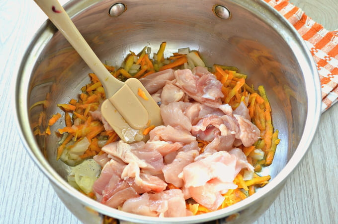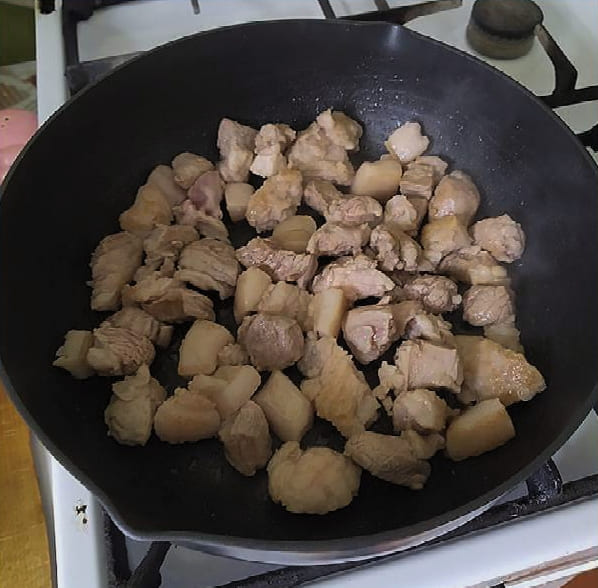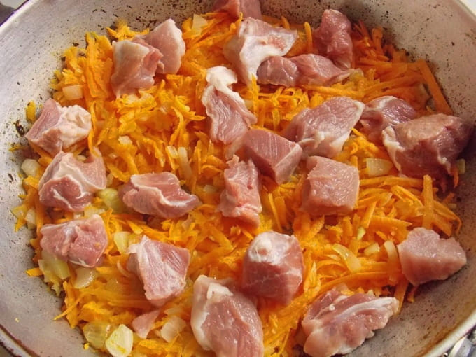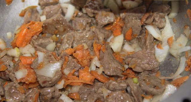 - Snijd het vlees in kleine stukjes van ongeveer drie tot vier centimeter groot en voeg het toe aan de groenten. Bestrooi met zout naar smaak en bak verder, en vergeet niet te roeren. We koken nog vier tot vijf minuten.