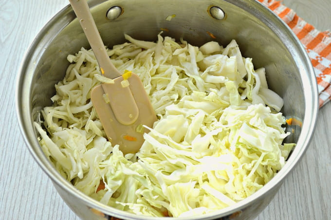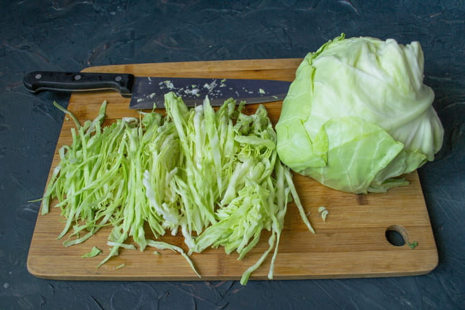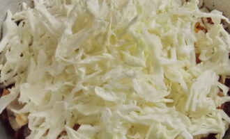 - Snijd op dit moment de witte kool in dunne reepjes. Dit kan snel en gemakkelijk met een speciaal shreddermes met gleuf. Kneed en knijp gehakte kool met de hand om de plantaardige vezels te breken en het volume te verminderen. Giet de voorbereide kool in de pan bovenop de gefrituurde massa met vlees.