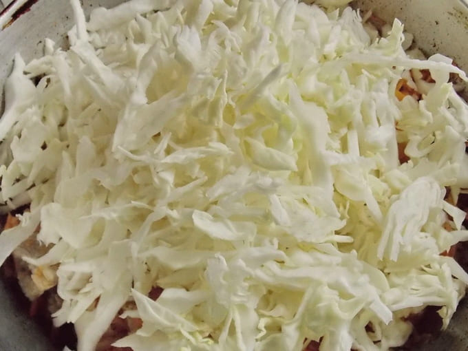 - Leg de gesneden kool op het aangebraden vlees en meng alles door elkaar.We sluiten de pan met een deksel en koken de inhoud twintig tot vijfentwintig minuten. Roer de massa een paar keer om aanbranden te voorkomen en til de rossige laag van onder naar boven op.