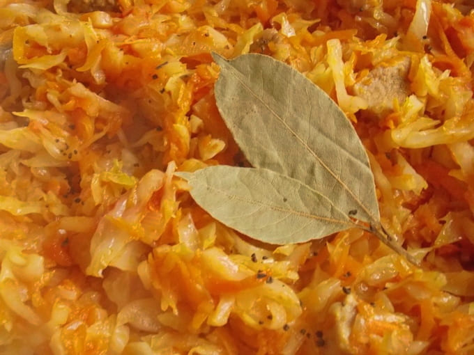 Voeg vijf minuten voor het koken zout naar smaak toe aan de pan, evenals zwarte peperkorrels en laurierblaadjes. Na het toevoegen van de kruiden de massa goed mengen en afdekken met een deksel zodat het pittige aroma in elk stuk doordringt.