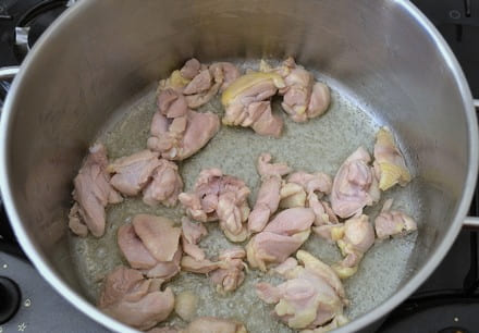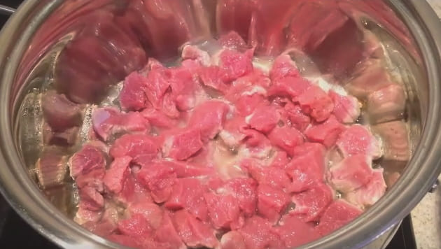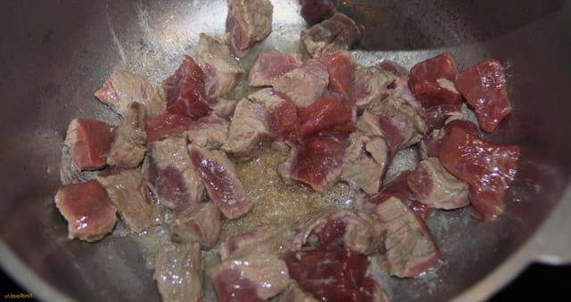 - Droog het vlees met een papieren handdoek van vocht en snijd het in kleine blokjes. Verhit een kleine hoeveelheid plantaardige olie in een ketel en leg het vlees erin. Bak de stukken op hoog vuur gedurende vier tot vijf minuten, af en toe roeren. Het vlees moet bruin zijn.