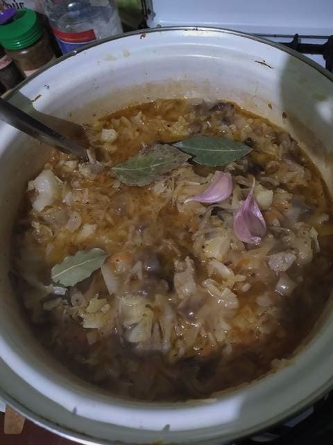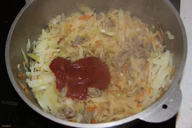 - Voeg na de aangegeven tijd tomatenpuree, zout en zwarte peper naar smaak toe aan de kool. Meng alles goed door elkaar en laat nog twintig minuten sudderen, afgedekt met een deksel. Aan het einde van het koken moeten de kool en stukken vlees heel zacht zijn.
