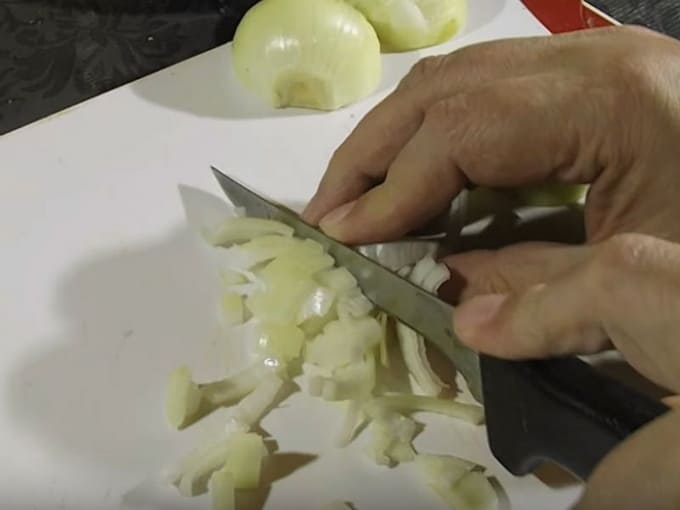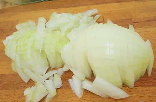 - We schillen de uien van de kaf, wassen ze en snijden ze in kleine stukjes of halve ringen, zoals je wilt.