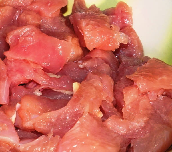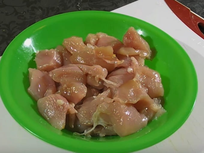 - We drogen het vlees en ontdoen het van eventuele botten, kraakbeen en huid. In dit geval gebruiken we kip, maar indien gewenst kun je ook andere soorten vlees toevoegen. Snijd de resulterende filet in kleine stukjes van willekeurige vorm.