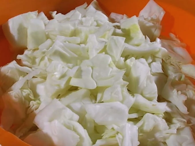 - Verwijder de bovenste beschadigde bladeren van de koolkop. Snijd het vervolgens in kleine stukjes. Het is niet de moeite waard om dun te hakken, want bij langdurig stoven in de oven zal de kool zijn structuur verliezen. De optimale grootte van de stukjes is anderhalve tot twee centimeter: de groente heeft tijd om te koken, goed te bakken, maar niet te zacht te worden. Plaats de gehakte kool in een volumetrische container.