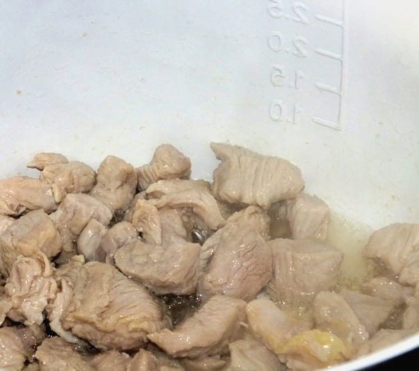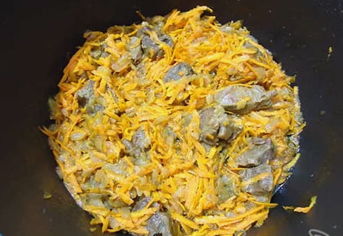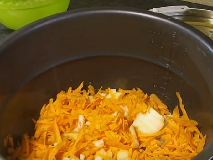 - Giet plantaardige olie in de multicooker-kom en stel de "Fry" -modus in. Als de olie goed verwarmd is, doe je de gesnipperde uien en wortelen in een kom. Bak het groentemengsel vijf tot zeven minuten, af en toe roeren. Nadat de aangegeven tijd is verstreken, doet u het vlees in de kom, mengt u en bakt u met gesloten deksel nog vijf tot zeven minuten verder.