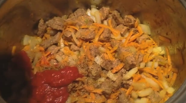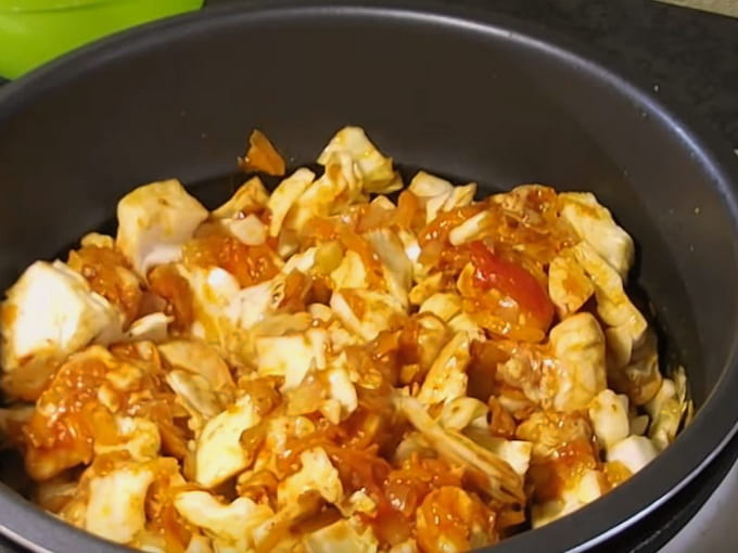 - Voeg vervolgens de tomatenpuree toe en roer. Leg op de gehakte kool, breng op smaak met zout, zwarte peper en laurierblaadjes. meng alles door elkaar, sluit het deksel en stel de modus "Blussen" gedurende dertig minuten in.