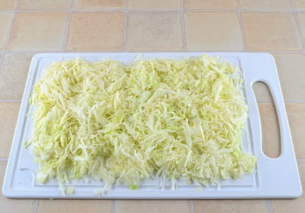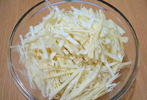 - Verwijder de bovenste beschadigde bladeren van de witte kool. Snijd de groente fijn. U kunt een maaidorser gebruiken om tijd en moeite te besparen.