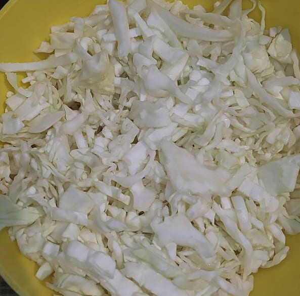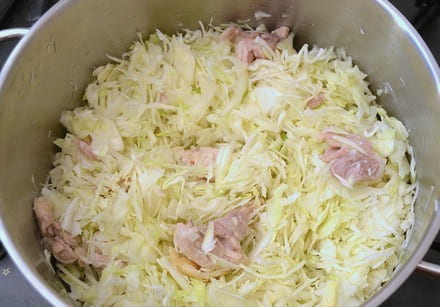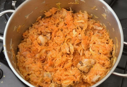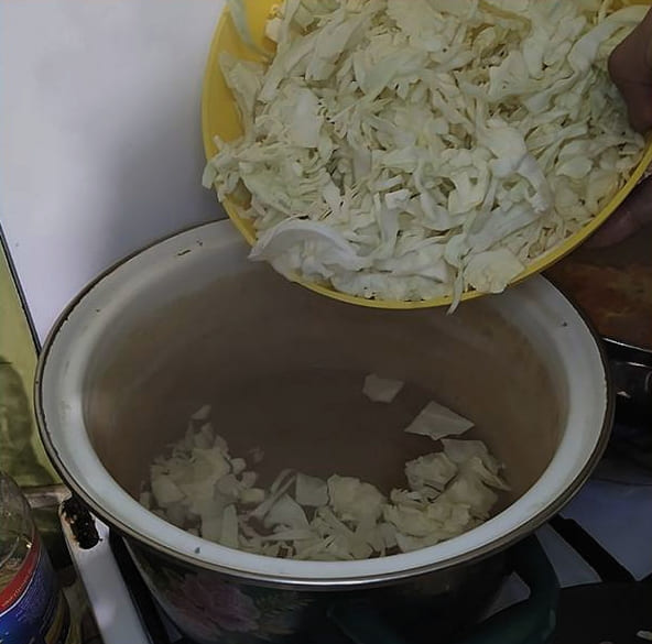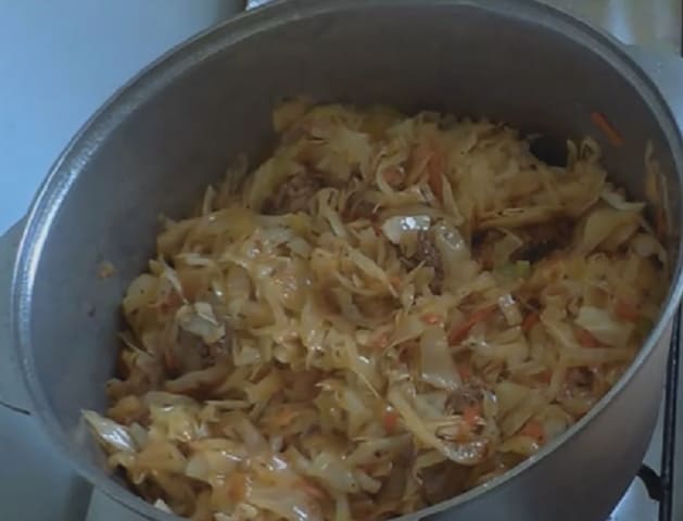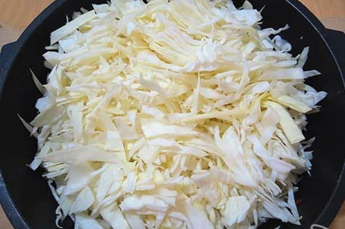 - Breng in een aparte grote pan twee glazen water aan de kook en dompel de gesnipperde kool erin. In deze pan brengen we vervolgens het hele gerecht klaar. We sluiten de pan met een deksel en koken de inhoud gedurende tien tot vijftien minuten op lage temperatuur.