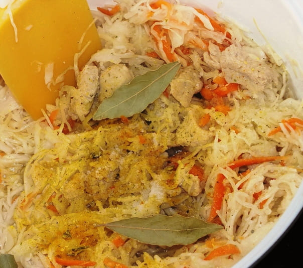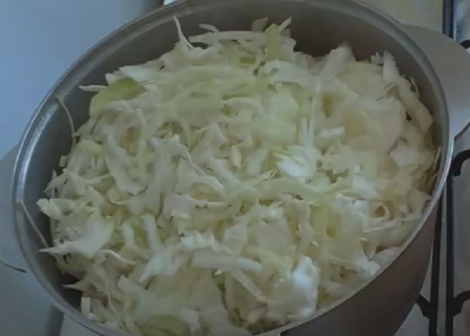 - Snijd de kool dun. Het is handig om dit te doen met een speciaal hakselaarmes of een maaidorser. We kneden de gehakte massa met onze handen zodat de plantaardige vezels zachter worden. Giet de kool in de ketel. Sluit direct de deksel zodat de kool een beetje stoomt en in volume afneemt.