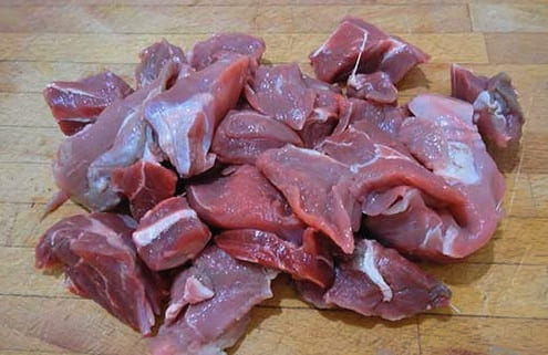 Droog het vlees en snijd het in blokjes van ongeveer anderhalve tot twee centimeter groot. Het is aan te raden om dwars door de vezels te snijden: zo voelen de stukken vlees als ze klaar zijn zachter en malser aan. Voeg gehakt vlees toe aan groenten. Roer alles door elkaar, sluit het deksel en laat tien tot vijftien minuten sudderen, af en toe roeren.
