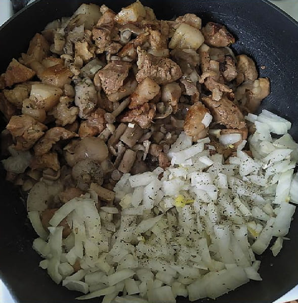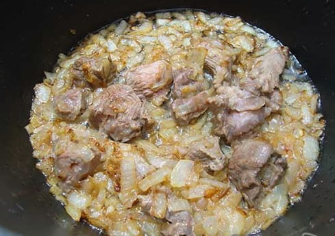 - Schil de uien, spoel ze af, snijd ze in kleine blokjes en voeg ze toe aan het vlees. Roer en bak met het deksel open tot de uien transparant zijn.