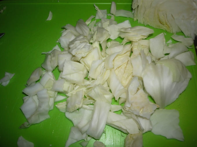 - Snijd, terwijl het vlees met champignons en uien wordt gebakken, de witte kool fijn.