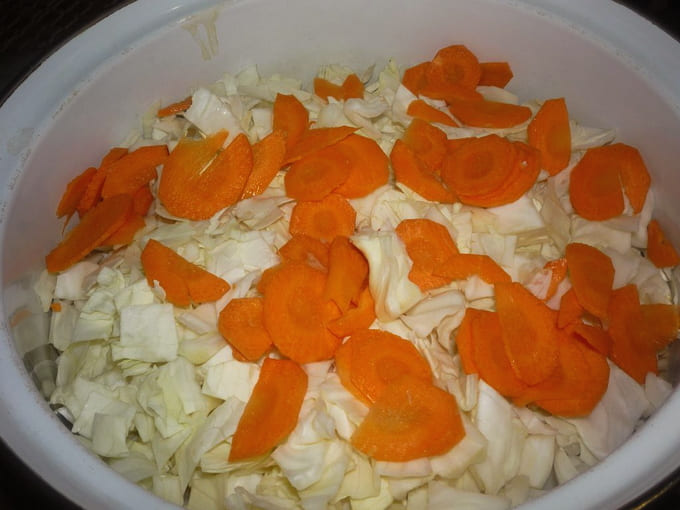 - Schil de wortelen van de bovenschil, spoel ze af en snijd ze in dunne plakjes. Giet wortelen bij kool.
