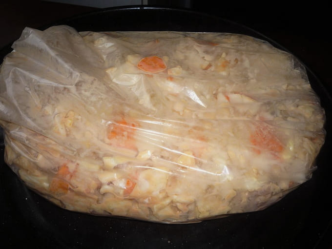 - Knip een stuk van de bakmouw af op de gewenste lengte. We binden het aan één kant en vullen het dan met het kool- en vleesmengsel. Daarna binden we de tweede zijde vast. Het is belangrijk om wat vrije ruimte in de hoes te laten zodat deze niet barst tijdens het bakken. Daarnaast is het de moeite waard om op meerdere plaatsen een paar dunne gaatjes te maken met een tandenstoker.Verwarm de oven voor op een temperatuur van 190 graden en zet de hoes met kool op het middelste niveau. We bakken twee tot twee en een half uur.